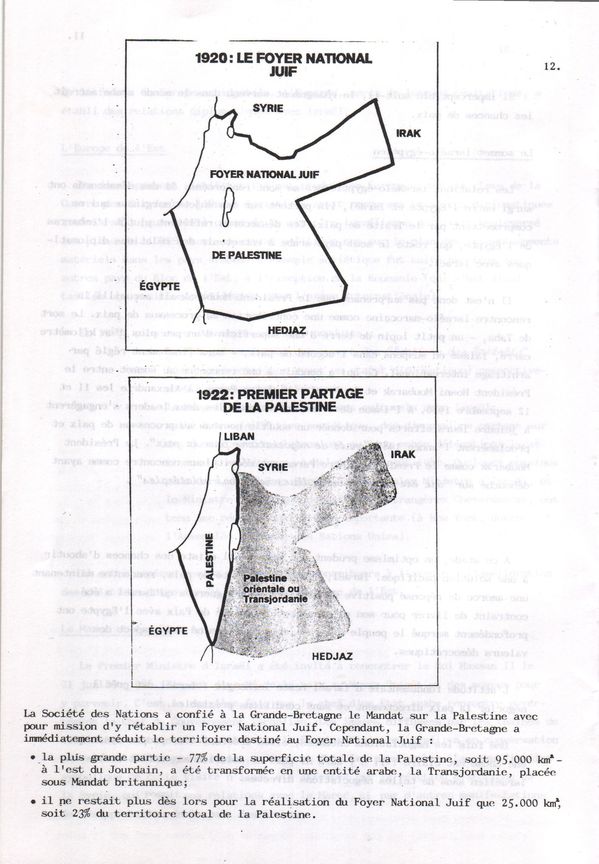 Pour rappel, lors du Mandat de la SDN donné en 1920 aux Britanniques qui les engageait à créer un foyer Juif en Palestine, ils partitionnèrent le pays en 1922 en détachant 77% pour créer l’Émirat de Transjordanie, (qui devint plus tard le Royaume Hachémite de Jordanie) ce qui n’était pas du tout prévu par le Mandat.